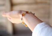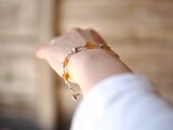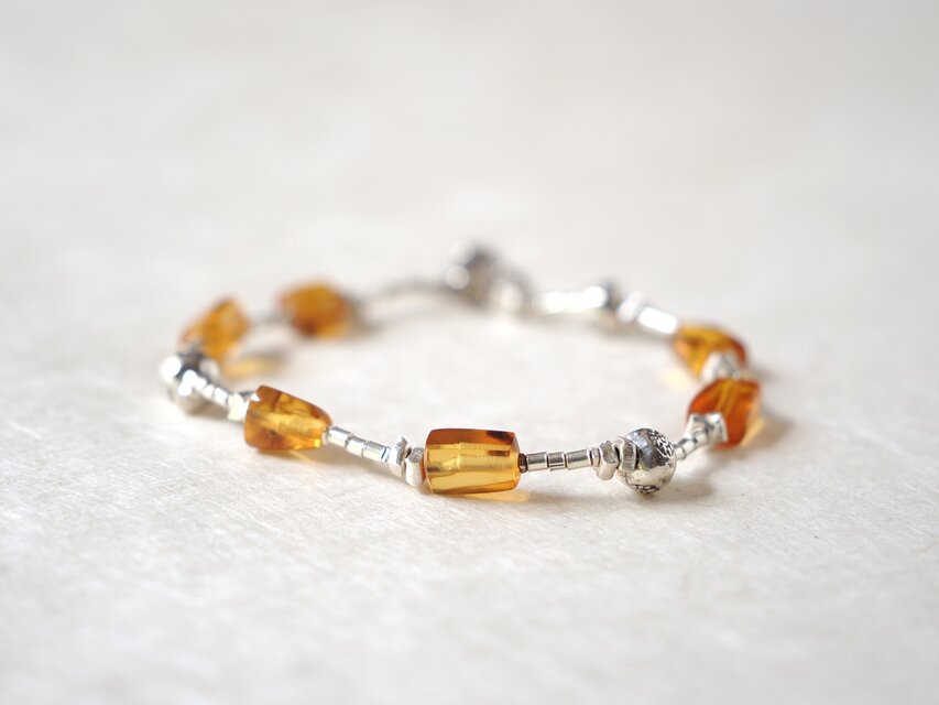 しっとりとした質感の琥珀とエスニック模様のカレン・ビーズを散りばめ、スタイリッシュなブレスレットに仕立てました。