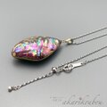 瑠璃色のオパールのような輝きを放つ精密に貼り合わせた螺鈿面に金沢の純金箔とプラチナ箔で孔雀の羽根模様を箔押しした表面と、濃桃色の螺鈿細工に施した箔押しのコントラストが美しい、両面共に楽しめる螺鈿漆ペンダント。