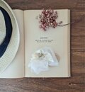 布花や英字リボン、ヴィンテージビーズを重ね合わせ、幻想的な「物語のカケラ」を胸元に留めるように仕立てました。