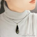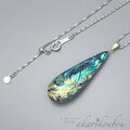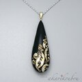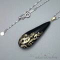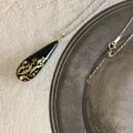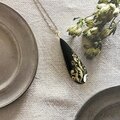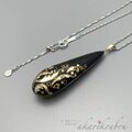 黒漆に金沢の純金箔とプラチナ箔で羊歯模様を箔押しした表面と、ブラックオパールのような輝きを放つ精密に貼り合わせた螺鈿面のコントラストが美しい、両面共に楽しめる漆螺鈿ペンダント。
