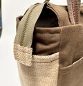 しっかりと自立するバッグですが、ポケット部分の織布に接着芯が貼ってあるだけで 本体にキルト綿や硬めの芯を入れていないので軽く そしてたためます。