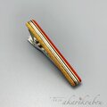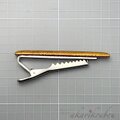 檜の木をシンプルに彫刻し、朱漆と純金粉の蒔絵に金沢箔でラインを施した、すっきりしたデザインの漆ネクタイピン。