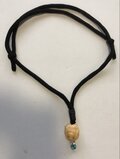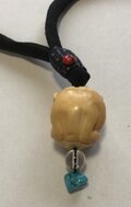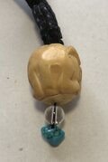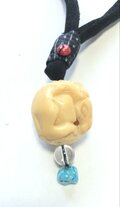 黒の着物で作ったループを付け、ループの先に、紅サンゴ、、干支の彫り物、最先端に水晶の玉、トルコ石を付けています。