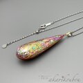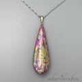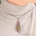 オーロラのような輝きを放つ精密に貼り合わせた螺鈿面に金沢の純金箔とプラチナ箔でレース模様を箔押しした表面と、本朱漆に施した箔押しのコントラストが美しい、両面共に楽しめる螺鈿漆ペンダント。