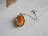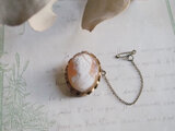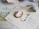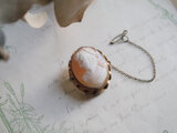 こっくりとした白いシェルに女性の横顔が彫られ、波打つようなゴールドトーンのフレームがそれを囲っています。