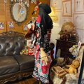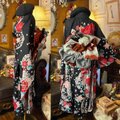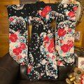 【 振袖 着物 ロングワンピース ドレス 2部式ローズ/バラ作り帯 リメイク 洗える 化繊 パールつけ襟 フリルシフォン帯揚げ 和洋折衷 ハンドメイド レトロ 古着 艶を含んだ漆黒地に、ごく細かな地紋がしっとりと浮かぶ FKW-27】