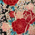 金彩で縁取られた取り文様の中に、深紅〜淡紅の薔薇と桜吹雪が重なり、翡翠色の葉がきりりと彩を添えます。