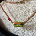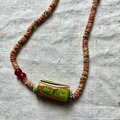 赤いビーズはボヘミアのトレードビーズ。全体に散らしたのは透過するベネチアのグリーンのシードビーズ