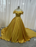 実例写真!カラードレス イエロー オフショルダー 光沢サテン プリンセスライン リボン 花嫁