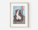 薔薇の模様のソファーに座る青い目の犬とルームランプを水彩絵の具で描きました