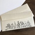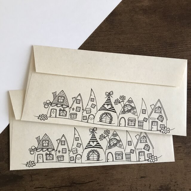 手描きのオリジナル家並みイラストをもとに、封筒を作りました。