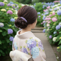 花の芯にはキラリと光るガラスビーズをあしらいました。光を受けると、まるで雨上がりの雫のように瑞々しく輝き、後ろ姿に涼やかな印象を与えます。