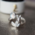 光の角度で白から虹色に変化する上質なレインボームーンストーンが印象的なリング。