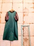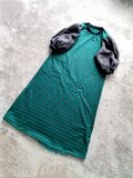 グリーン&ブラウンボーダーにお袖リネンのパフスリーブワンピース