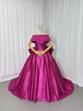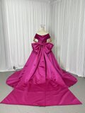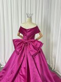 カラードレス ビビッドピンク 光沢サテン オフショルダー 豪華なバックリボン プリンセスライン 披露宴