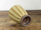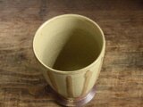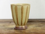 素地に化粧泥を掛けてから泥漿を入れたスポイトで上から1本ずつ流した後、カップ全体に伊羅保釉を掛けて焼成しています。