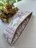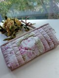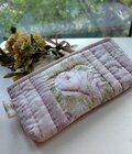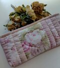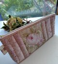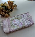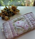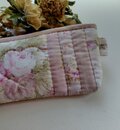 薄いピンク系の生地をはぎ合わせたロマンチックで優しい雰囲気のファスナーポーチです。