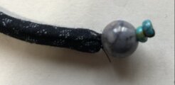 中綿を入れ、男絣の着物で作ったループを付け、ループの先にアクアマリンの玉とトルコ石を付けています。