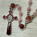 果物のグァバの果肉に似ている色であることから「グァバクォーツ」という流通名のついている天然クォーツ(鑑定済みとのこと)を使用したロザリオです。