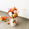 小さなパンプキンやカラフルなカラマツ、ワタカラなどの木の実やベリーを合わせてトピアリーにしました。