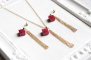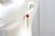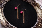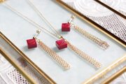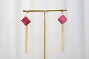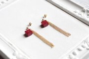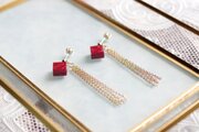 光沢のあるルビーレッドのキューブとゴールドのフリンジが耳元で揺れる様子が可憐なピアス。