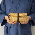 その技術を生かし、現代の日常で長く使っていただけるように素材はコットンむら染黄色地を選び、金泥と中色泥(金と銀の間の色目)を使い