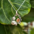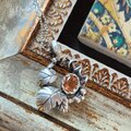 よく 輝くサーモンピンクのトルマリンを葉っぱなどの中心に留めました。