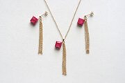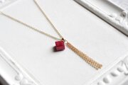 光沢のあるルビーレッドのキューブとゴールドのフリンジが胸元で揺れる様子が可憐なピアス。