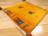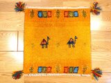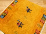 柔らかな黄金色に、ラクダの親子の模様が愛らしい手織りギャッベ。