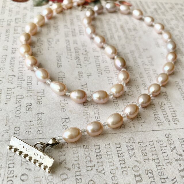 やわらかなピンク色の淡水パールが並ぶ、上品なネックレス。