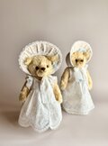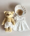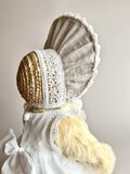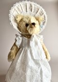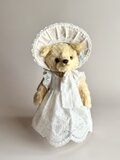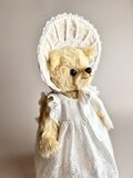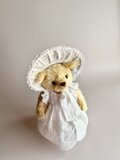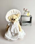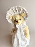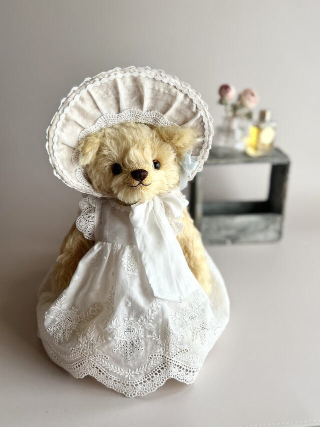 憧れのボンネットを被ったベア、ネットでの販売は久し振りでしたが、3年と少し、待った甲斐が、ありました! 今回は、ライトイエローの柔らかいカールで、お顔もとても愛らしく、レースのドレスもとても素敵で、間違いなく コレクションの上位に入ります。 幸せな日になりました♡