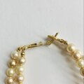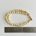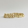 こちらはガラス素材の原玉に、オリジナルカラーのパール塗料にて何層にも渡り重ね塗りを施した日本製ガラスパールブレスレットになります。パールカラーはきめ細かい質感と優しい艶感が特徴のゴールド系カラーパール各種を使用。複数のカラーをランダムに配置しました。直径約6mm玉で、長さはややゆったり目で金具を含む全長約19cm。留め具には約40年程約前で未使用のvintageクラスプを使用。デザイン/仕様は特徴的で脱着にはややコツが必要かと思います。古くよりあるデザインとなっております。ご購入の際は何卒ご了承のほどよろしくお願いいたします。