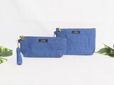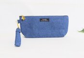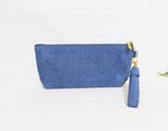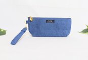 落ち着いた色合いのブルーデニム綿地の少し大きめサイズの持ち手付きペンケースです。