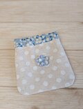 口の部分には青い小花の生地を使い、中央には青い飾りビーズをアクセントにつけました。