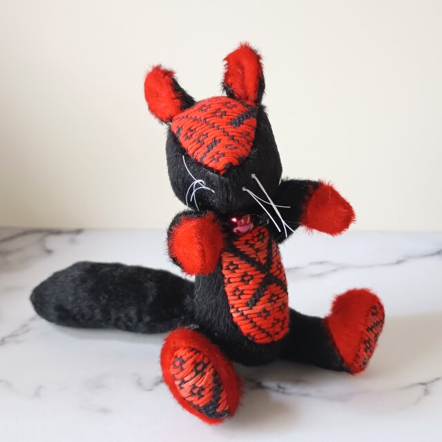 「総刺しこぎん猫」は、こぎん刺しを生地全面に施した「総刺し」を使った動物ぬいぐるみ。