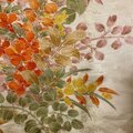 そこへ橙・金茶・朽葉・若草・オリーブ・灰桜を重ねた枝葉と小花が連なり、肩から裾へ絵羽調に流れます。