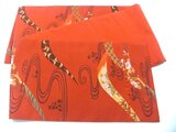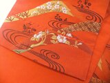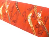 ■帯中裏に「宝楽」と名がございます。新品の帯をリメイクしました。赤茶地に流水草花文様です。贈り物にも最適です。