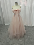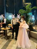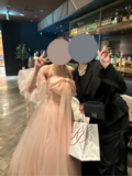 実例写真!カラードレス 薄ピンク ベアトップ パフスリーブ リボン ふわふわドレス 編み上げ 二次会