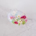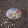 柔らかな輝きを放つ天然石「オパール」に、秋を彩るコスモスモチーフと金沢箔を組み合わせた帯留めです。オパールの光の遊びが、淡いピンクや赤のコスモスを優しく引き立て、金箔の煌めきが華やかさを添えています。