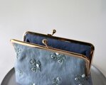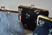 ビーズの小花を散らしたリネンがま口ポーチ。