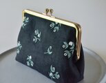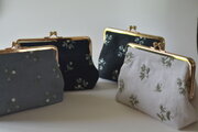 ビーズの小花を散らしたリネンがま口ポーチ。