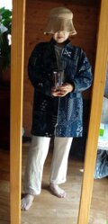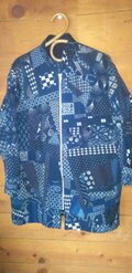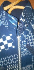 久留米絣の藍染めを集めて、ランダムにパッチワークしたコートを作りました。