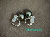 原点回帰。シンプルなタヒチ黒蝶真珠のイヤリングです。9.7x9.7mmのセミラウンド。艶のあるダークグリーンが落ち着きのある美しさですね。クリップタイプの直結デザイン。珠のサイドに少し傷はありますがテリが良いので気にならないレベルだと思います。