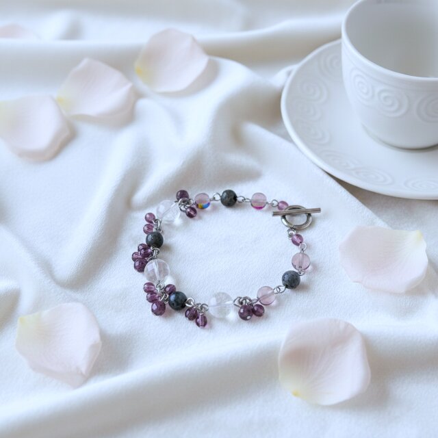 シックなグレーと淡いピンク、透明感のあるクリアビーズを組み合わせ、落ち着きの中に華やかさを感じさせるブレスレット。