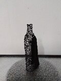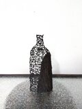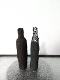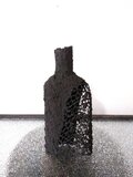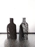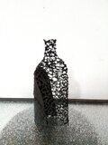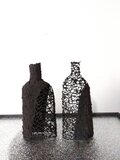 ペーパーマシェのボトル型のオブジェを2つに切り分けて、それぞれにワイヤーワークをプラスして、元の形を再現したものです。錆びたような質感は、黒土を接着剤で練ったものを固着させて出しています。底面は閉じていないので、中に小さなガラス瓶などを置いて生花を生けることができます。ドライフラワーはそのまま飾れます。とても軽いので、ダルマピン1本で壁に掛けることもできます。照明の当て方で美しい影が現れます。