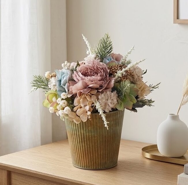 アンテークな雰囲気のゴールド系のブリキの器に上質なアーティフィシャルフラワーを使用したエレガントなラウンド型のアレンジメント。