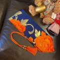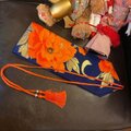瑠璃紺の帯ベルトと朱橙のタッセルを重ねると、椿柄のオレンジがいっそう映えてモダンに。
