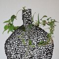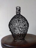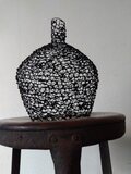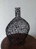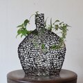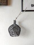 ワイヤーを編んで制作したオブジェです。錆びたような質感は、黒土を接着剤で練ったものを固着させて出しています。底面は閉じていないので、中にガラス瓶などを置いて生花を生けることができます。ドライフラワーはそのまま飾れます。とても軽いので、ダルマピン1本で壁に掛けることもできます。照明の当て方で美しい影が現れます。