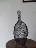ワイヤーを編んで制作したオブジェです。錆びたような質感は、黒土を接着剤で練ったものを固着させて出しています。底面は閉じていないので、中にガラス瓶などを置いて生花を生けることができます。ドライフラワーはそのまま飾れます。とても軽いので、ダルマピン1本で壁に掛けることもできます。照明の当て方で美しい影が現れます。