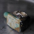 ネイビーブルーに乳白色のラインがシックな印象のトラピッチェサファイアをラフな飾り枠を施しシルバーリングに仕立てました。